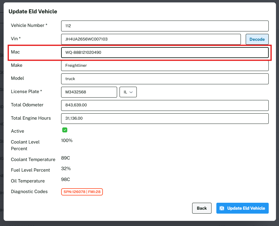 Тhe ELD vehicle 112 has a MAC set to WQ-88B121020490, this means that when the driver with the Truck 112 assigned to it the connection to WQ-88B121020490 will be attempted.